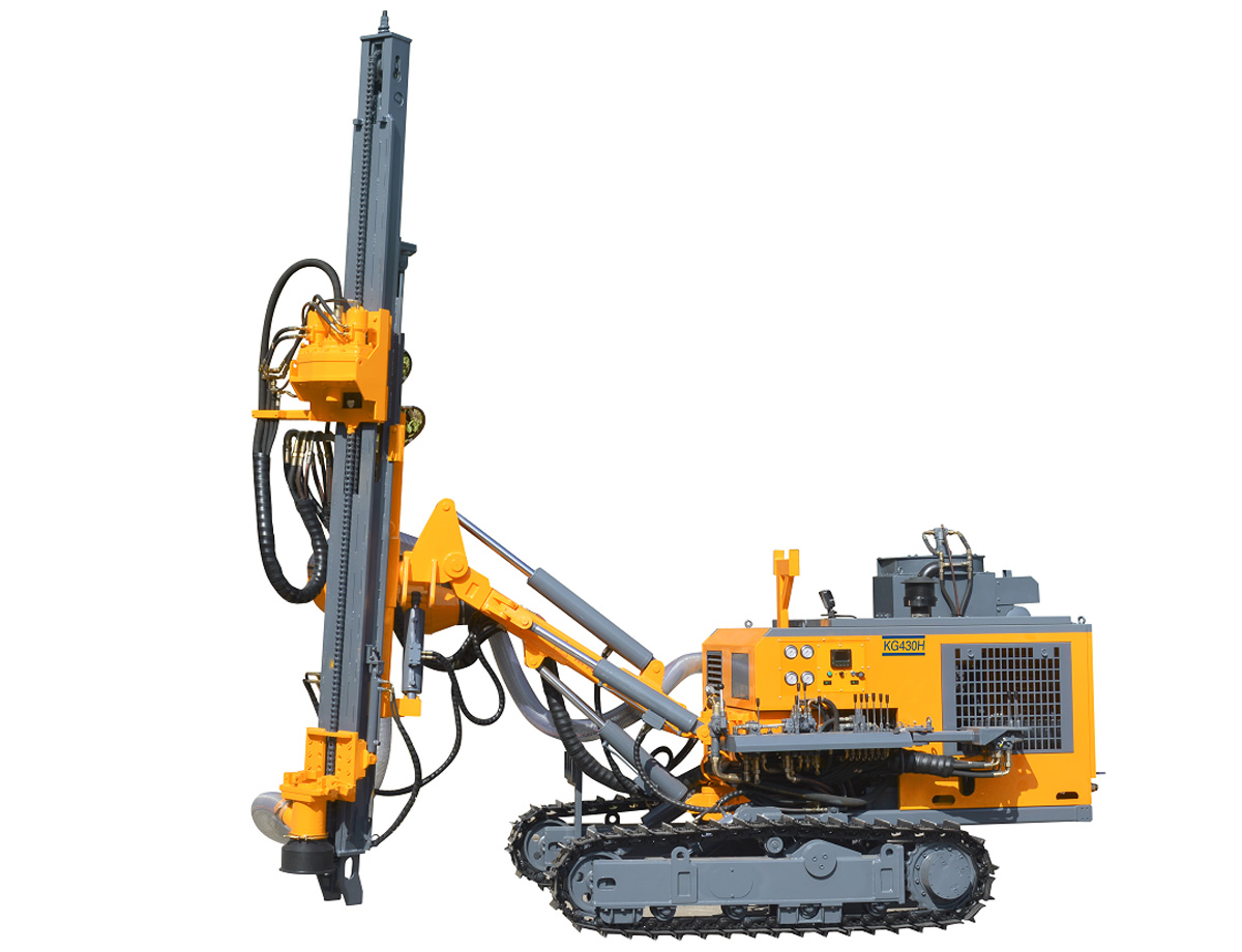 KG430/KG430H型露天潛孔鉆車是應(yīng)國家對環(huán)保要求而進(jìn)行升級的一款新設(shè)備。配備玉柴四缸國三發(fā)動(dòng)機(jī),滿足國家對排放和環(huán)保的要求。采用柱塞行走馬達(dá),折邊履帶架和工程四輪一帶,提高工作壓力,增加爬坡性能。增大俯仰和舉臂油缸,滿足極限位置使用要求。同時(shí)對液壓系統(tǒng)升級,增大系統(tǒng)流量,提高回轉(zhuǎn)轉(zhuǎn)速。回轉(zhuǎn)器采用雙馬達(dá)減速器,增大回轉(zhuǎn)扭矩和轉(zhuǎn)速。對加大提升油缸和鏈條,提高提升力和可靠性。加固導(dǎo)軌和增加滑板上下耐磨板,延長使用壽命。導(dǎo)軌采用傾斜安裝,方便操作和觀察。罩殼采用加厚型材折邊,增加強(qiáng)度和剛性,增加起吊吊環(huán),方便裝卸吊裝。