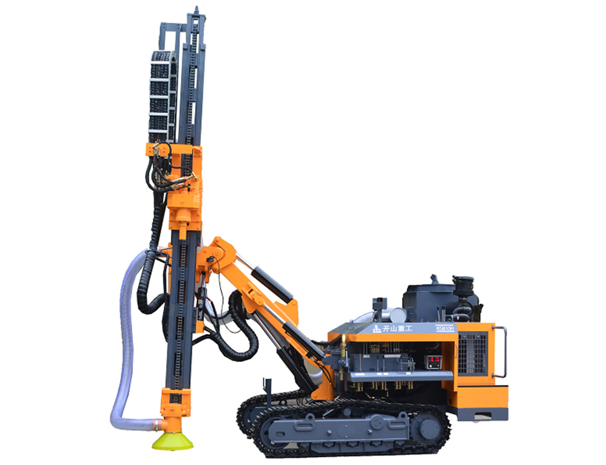 KG610/KG610H型露天潛孔鉆車是應(yīng)國家對環(huán)保要求而進(jìn)行升級的一款新設(shè)備。配備玉柴四缸國三發(fā)動機(jī),滿足國家對排放和環(huán)保的要求。采用柱塞行走馬達(dá),折邊履帶架和工程四輪一帶,提高工作壓力,增加爬坡性能。增大俯仰和舉臂油缸,滿足極限位置使用要求。同時對液壓系統(tǒng)升級,增大系統(tǒng)流量,提高回轉(zhuǎn)轉(zhuǎn)速?;剞D(zhuǎn)器采用雙馬達(dá)減速器,增大回轉(zhuǎn)扭矩和轉(zhuǎn)速。對加大提升油缸和鏈條,提高提升力和可靠性。加固導(dǎo)軌和增加滑板上下耐磨板,延長使用壽命。導(dǎo)軌采用傾斜安裝,方便操作和觀察。罩殼采用加厚型材折邊,增加強(qiáng)度和剛性,增加起吊吊環(huán),方便裝卸吊裝。