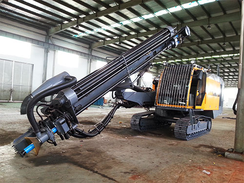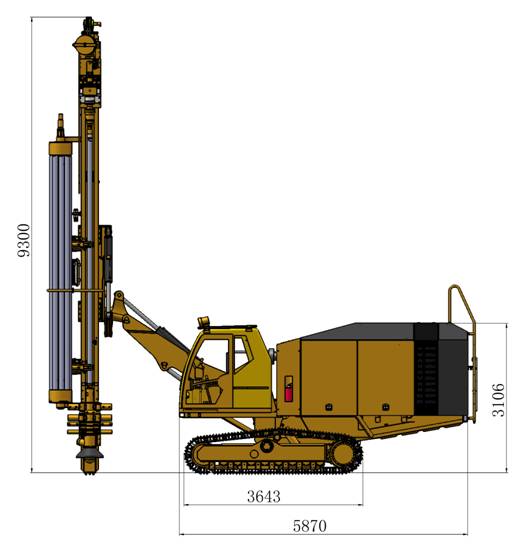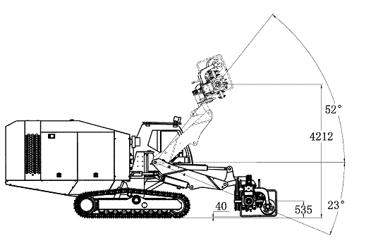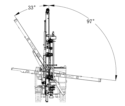 3. 滑架擺角采用經(jīng)過優(yōu)化的變幅機(jī)構(gòu),總擺角達(dá)130°(右97°,左33°),無需更換支點(diǎn)可自由完成豎直孔與水平孔的轉(zhuǎn)換;最低水平孔高度550㎜,最高可達(dá)4500;